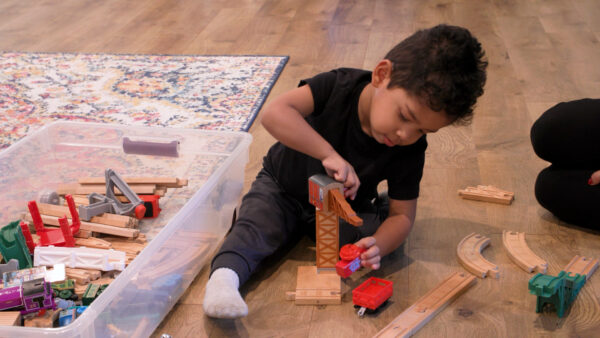 - 使用他们的辅助性/替代性沟通设备 (AAC), 请求照顾者帮忙移动火车轨道, 以便在地板上搭建一座积木塔。
