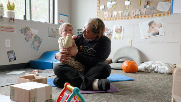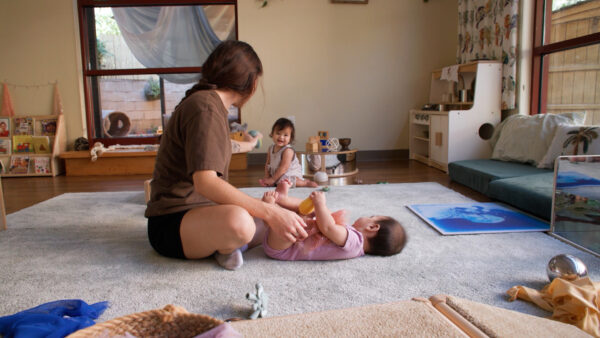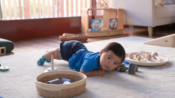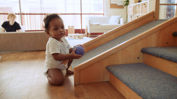 - 走向在地板上玩耍的婴儿, 同时看着照顾者, 一边说: “看看我! ” 并轻轻地碰触婴儿的手和打招呼。“嗨, 宝宝! ” 照顾者说: “做得很好!你记得要温柔对待宝宝。”