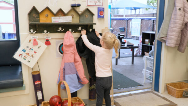 - 当照顾教育工作者请他们拿衣服准备到户外时, 孩子从自己的储物格中拿出外套和帽子。