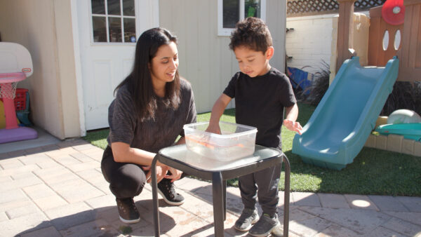 - 當照顧者用西班牙語說「 你準備好出去散步了嗎? 」 後,舉起雙臂讓照顧者抱起他們。