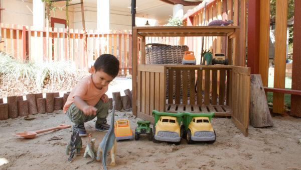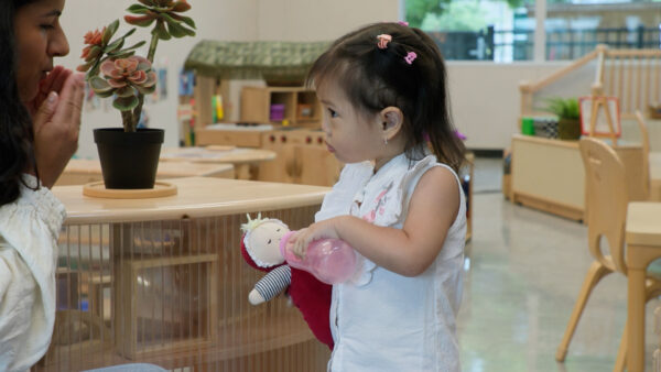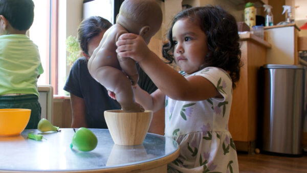 - 注意到擺放玩具車的籃字裡有一個動物玩具,並用西班牙語溝通說:「Mira」( 看),然後把動物玩具從籃子裡拿出來,和其他動物玩具放在一起。