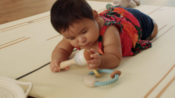 - 微笑回應正在輕輕搖晃搖鈴的家人,並聆聽搖鈴發出的聲音。