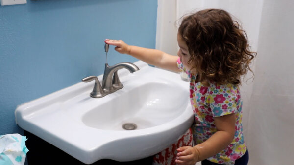 - 在戶外玩耍後脫掉鞋子並將外套掛在儲物櫃裡,然後走到水槽處洗手。